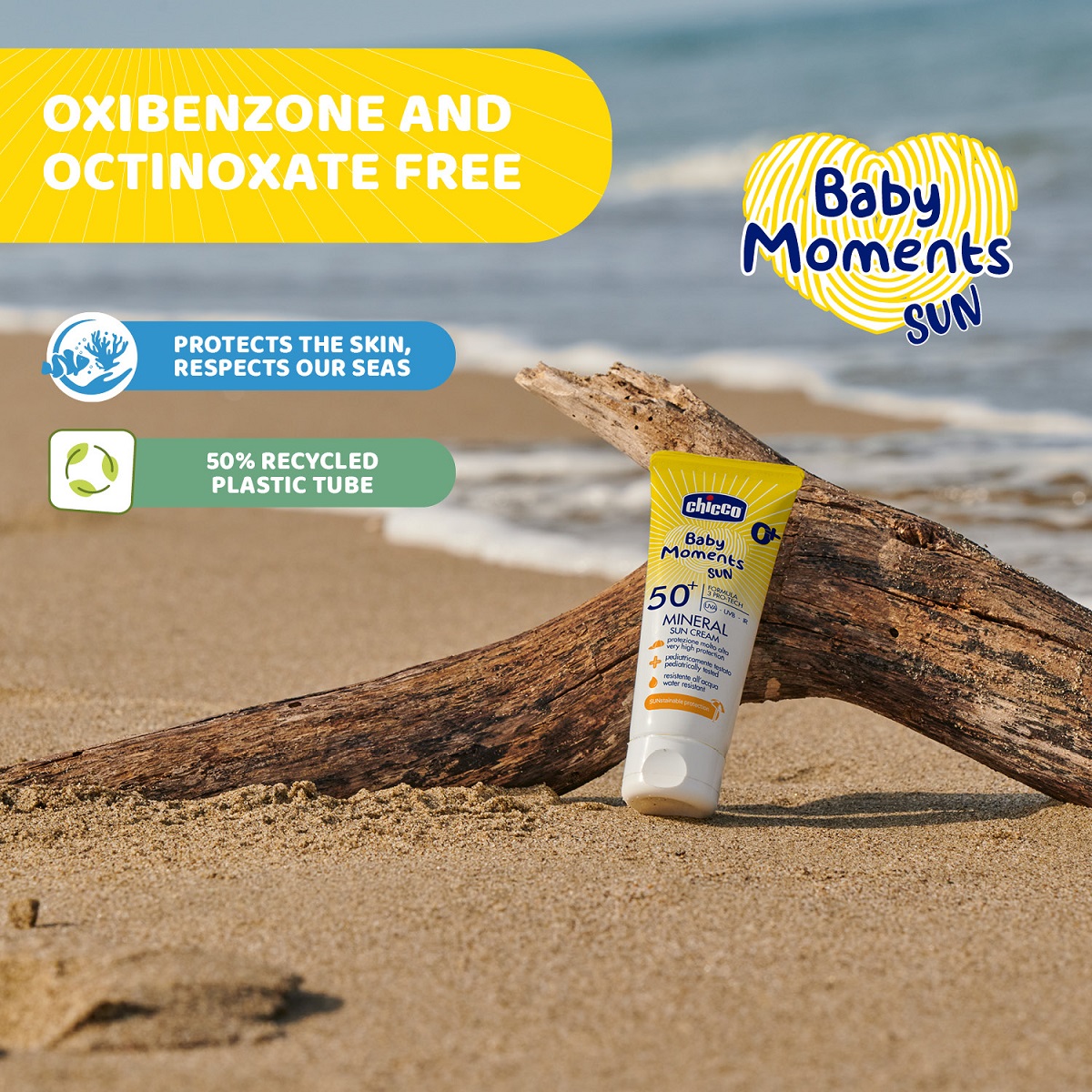 0m+ El protector solar en crema con FPS 50+ de Chicco, ofrece alta protección y está diseñado específicamente para proteger la delicada piel de los bebés de los rayos UVA, UVB e infrarrojos con su barrera de triple protección. A base de filtro físico de origen mineral actúa creando una barrera física reflectiva en donde los rayos solares se reflejan previniendo a la piel de absorberlos y reduciendo así los riesgos de la exposición al sol. Tiene una fórmula de emulsión de agua en aceite que permite que el agua se disperse en la parte grasa garantizando una particular resistencia al agua.